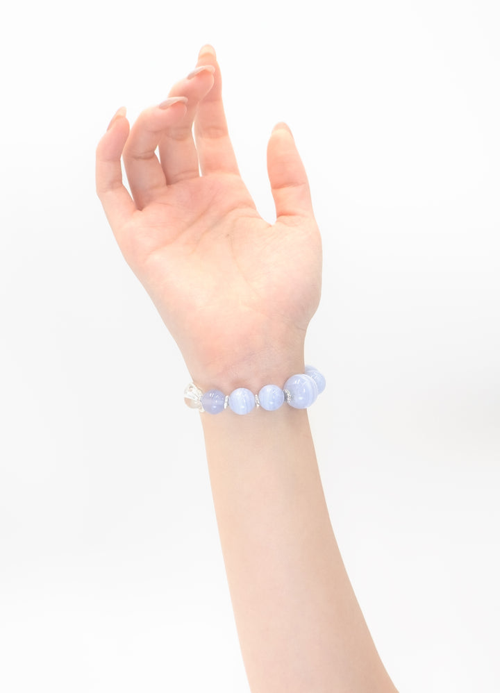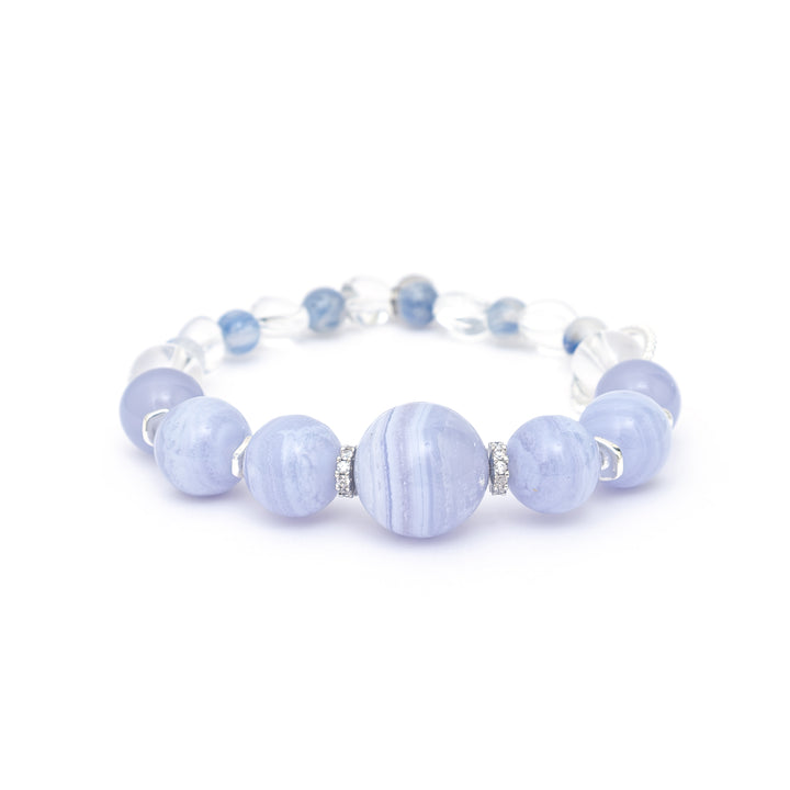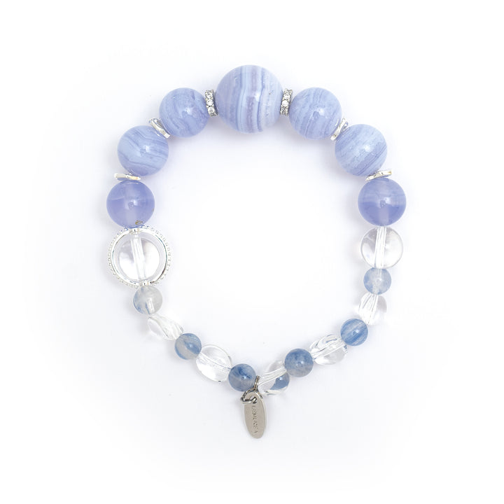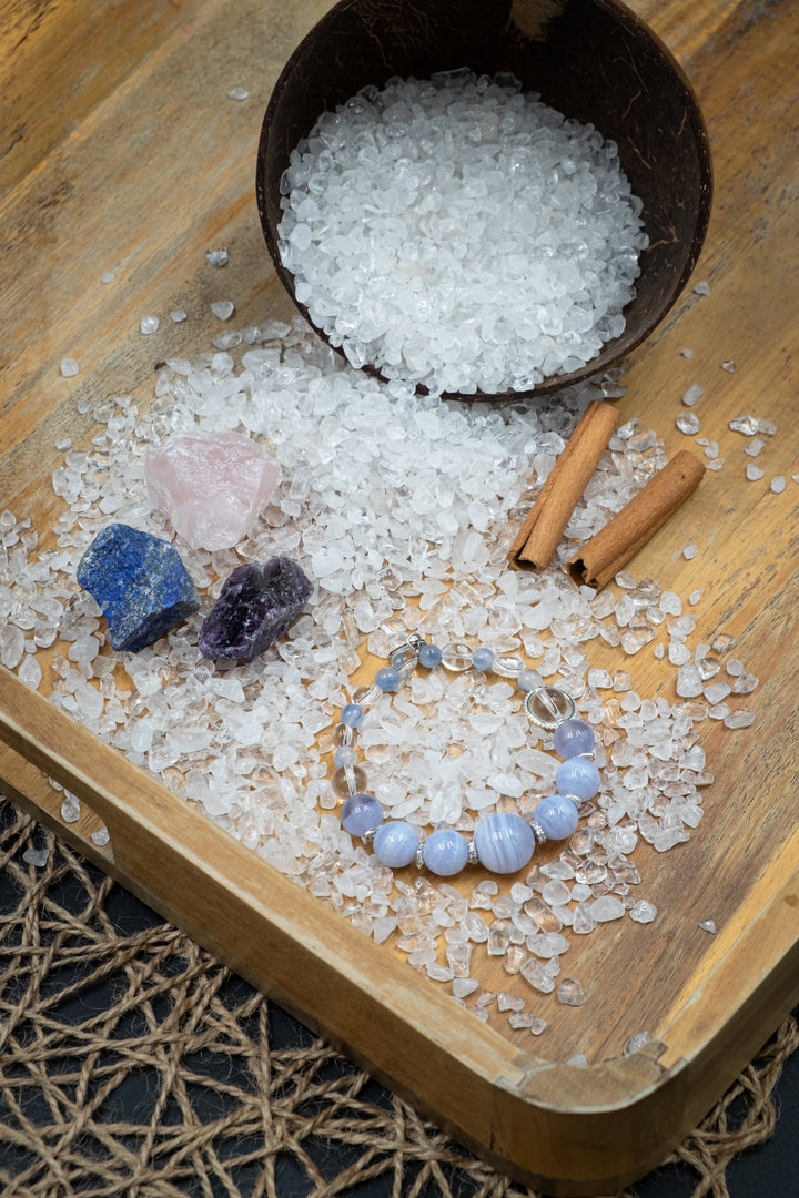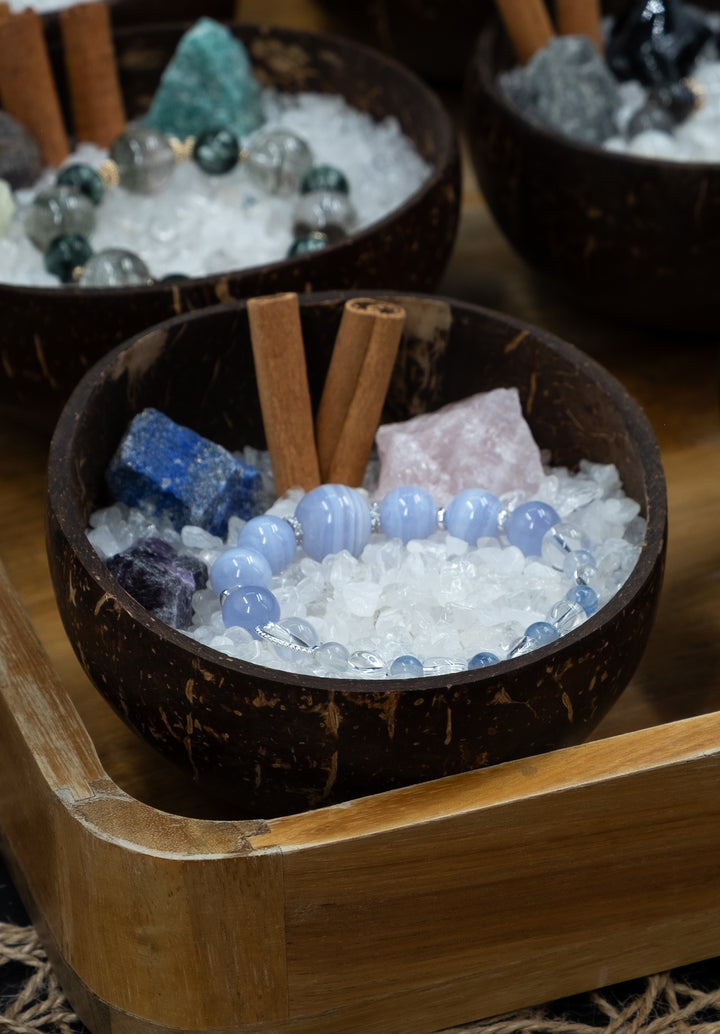 Blue Lace Agate, with its soft sky-blue bands, is celebrated for its soothing, peaceful energy. It gently eases stress, enhances communication, and fosters emotional balance, making it a perfect companion for clarity and serenity.