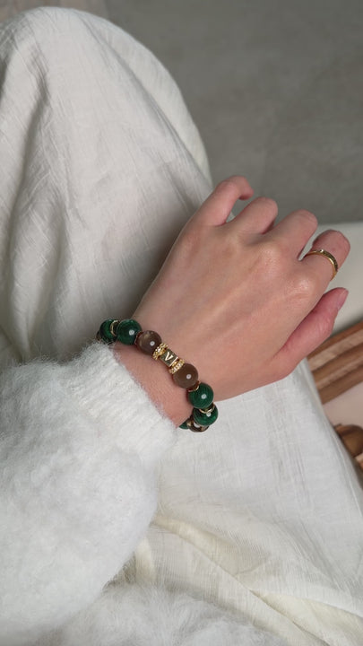 Gemstone Synergy: Luminous Moonstone radiates sacred feminine energy and intuition, while vibrant Malachite fosters inner transformation. Together with the grounding force of Smoky Quartz, they create a powerful shield of protection, clarity, and enduring grace.