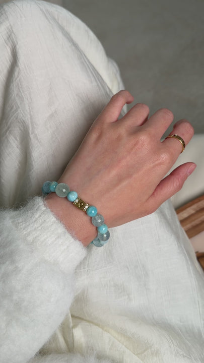 Gemstone Synergy: Ethereal Aquamarine brings soothing clarity and protection, while the tranquil ripples of Larimar nurture emotional healing. Together, they form a luminous talisman of serenity.